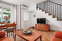 Our properties are elegant townhouses available for rent, distributed over two floors and designed to ensure maximum comfort. On the ground floor, you’ll find a spacious living-dining room with air conditioning and direct access to a private, furnished porch, perfect for relaxing outdoors. Additionally, there is a guest toilet, an independent, fully equipped kitchen, and a practical annex with a washing machine. On the upper floor, there are two bedrooms with wardrobes and garden views: one with a cozy double bed and the other with two comfortable single beds. Completing the space is a well-equipped main bathroom.