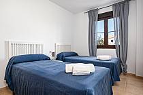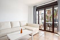 This apartment is located on the 2nd floor, featuring a terrace and solarium, perfect for sunbathing in privacy, with views of the central gardens and pools. It has 2 bedrooms, both equipped with lined wardrobes and reinforced viscoelastic mattresses, combining firmness and softness. The spacious and bright living-dining room is furnished with a dining area and living space, offering direct access to the terrace and stairs to the upper solarium. The terrace will undoubtedly be your preferred spot, where you can enjoy the pleasant temperatures thanks to the proximity of the sea. The independent kitchen is fully equipped, including a dishwasher, and the distribution is completed with a full bathroom. Exclusively, the apartment features air conditioning in the bedrooms and living room, thanks to a ducted air conditioning system.